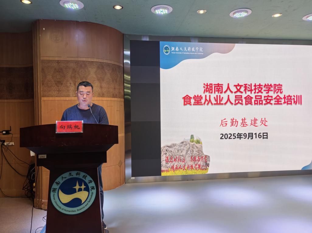 为进一步加强食品安全管理,切实保障师生饮食安全与健康,9月16日晚,后勤基建处饮食服务中心在养根楼报告厅组织召开了食堂从业人员食品安全培训会。后勤基建处处长向瑞桃出席,饮食服务中心各科室、自营食堂、托管食堂以及档口全体员工参加,会议由饮食服务中心负责人周浩主持。