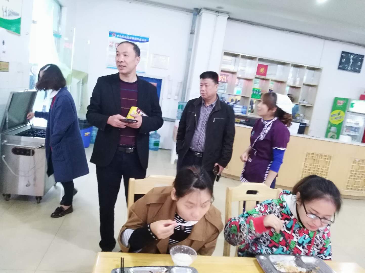 首先,胡主任来到教工餐厅,针对冬季冷风大、前台的工作人员太冷的情况,责令餐饮科安装屏风,改善和装饰前台环境;对免费汤的供应提出要确保汤的质量,调整汤的摆放位置;对教职工用餐区的管理提出在就餐高峰期要有人员督促管理,确保教师用餐有座位;对操作间中冰柜内的食品分类,提出要严格将生、熟食品和半成品分开存放。