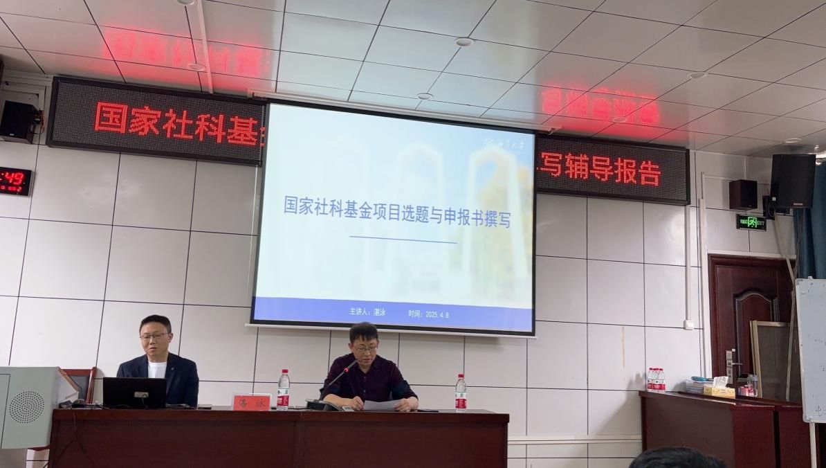 为进一步推进我院有组织科研,提高国家社科基金申报质量,4月8日,湘潭大学湛泳教授应邀来我院作国家社科基金项目申报辅导报告。报告会在高韵楼101举行,院长刘辛田主持,全院教职工及研究生参加会议交流。