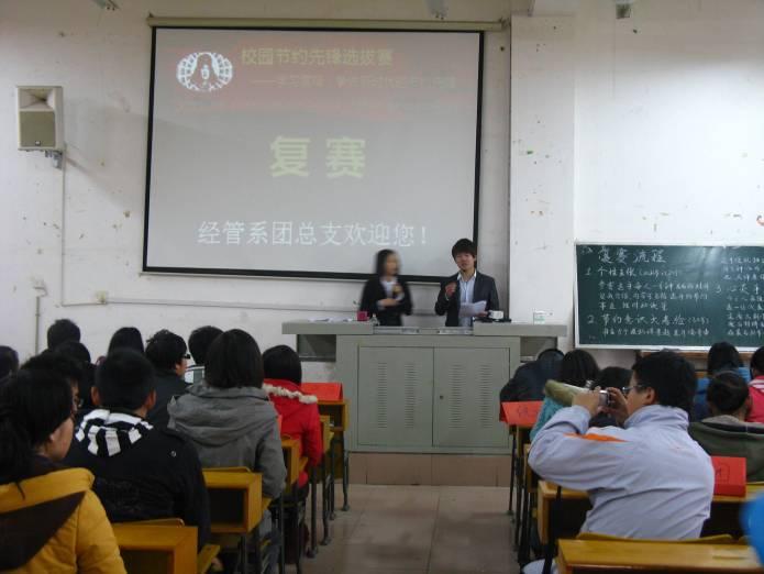 2011年3月23日中午12点30分,由我经管系团总支组织的“校园节约先锋”选拔赛复赛在17栋601多媒体教室隆重举行。系团总支书记丁剑老师、李兰老师出席并指导了本次比赛,参赛选手为在初赛中脱颖而出的18位同学。