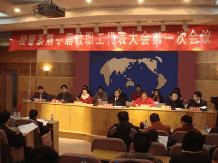 在学校党委行政的直接领导下,经报请校工会同意,经济与管理科学系第一届教职工代表大会第一次会议正式会议于2010年1月18日上午在学校多媒体报告厅隆重召开。出席并指导本次教代会的学校领导有学校党委书记姜正国教授、学校党委副书记校长柏连阳教授和学校党委委员校工会主席邓和秋研究员,以及校工会刘文红副主席和刘烨副主席,各教学教辅单位的党总支书记和分工会主席。会议由刘辛田副书记主持。