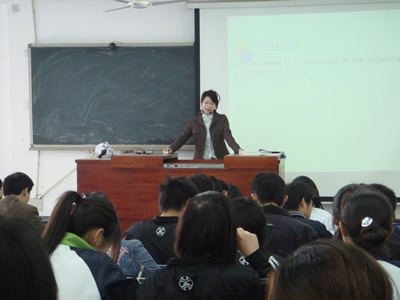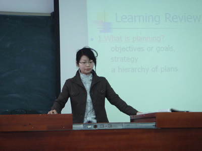 3月27日第一节课,5栋教学楼301室座无虚席,主讲教师刘海艳正用流利的英语讲授《管理学原理》。这是经济与管理科学系人力资源管理教研室首次举行的双语教学公开课。系党政领导与大部分教师都参加了这次活动。此次公开课拉开了经济与管理科学系青年教师互相学习互相促进、积极推行双语教学等系列活动的序幕。(胡益龙供稿)