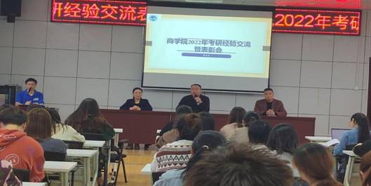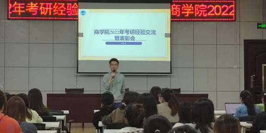 5月27日下午,商学院在高韵楼101举行2022届考研经验交流暨表彰会,党总支书记刘辉,副院长王晓军,副书记胡益龙出席,2022届考研录取学生代表、19级20级部分学生参会,曾文果主持。