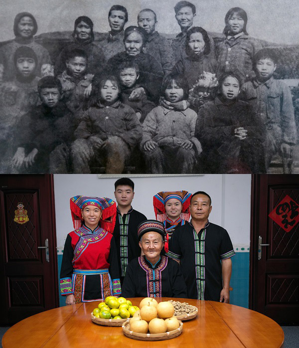 徐解秀一家上世纪八十年代的全家福和徐解秀的儿子朱中雄一家于2020年拍摄的全家福