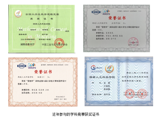 本专业学生在大学期间可以参加挑战杯、互联网+大学创业竞赛、机械设计大赛、ACM程序设计、机器人高尔夫、机器人接力赛、数学建模等学科竞赛和研创项目,近年取得成绩显著。由易叶青老师指导的学生获得全国数学建模湖南赛区一等奖和全国一等奖。其次还获得湖南省程序设计大赛软件开发项目一等奖、机器人高尔夫二等奖等多项奖励。