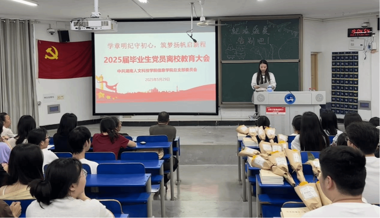 5 月 29 日,信息学院召开 2025 届毕业生党员离校感恩教育大会,聚焦纪律教育与廉洁从业,为毕业生党员上好离校 "最后一课"。学院党总支书记刘凤龙、院长谢四连及全体学生党支部书记、毕业生党员参会。