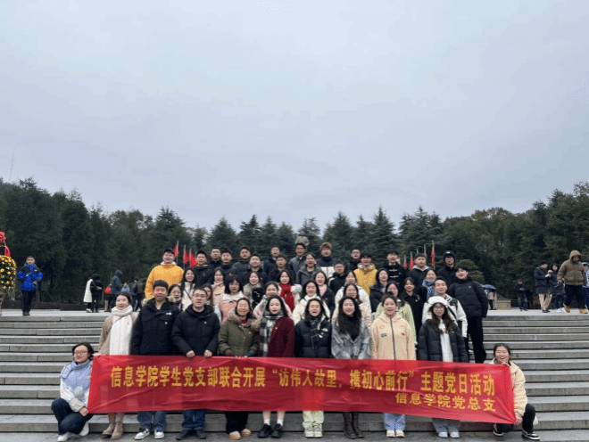 为进一步深入开展学习贯彻习近平新时代中国特色社会主义思想主题教育,2023年12月17日,信息学院党总支组织各内设学生党支部本年度新发展的党员赴韶山毛泽东故居、花明楼刘少奇故居联合开展“访伟人故里,携初心前行”主题党日活动。
