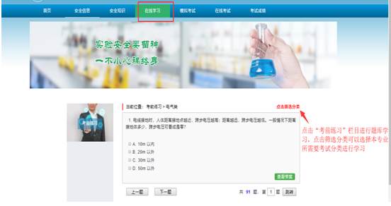 4、考试次数及达标分数。本次安全考试系统设定的每个学生可考试次数为5次(最后成绩取最优成绩),达标分数为85分。请同学们在规定的时间内登录系统在“安全知识”中选取相应模块进行线上学习、在线模拟考试合格后再进入到考试系统考试,只有安全知识考核达标的学生才允许进入实验室进行实验。