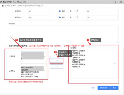 选中左上角的【新增】按钮后,补充完整各项开课信息,将课程编号输入上去。注意:课程信息一定要填写完善,以免之后进行开课安排时不必要的修改操作。【课程编号】按学校实际编号手动输入(参照2019版人才培养方案。新开设的课程由教务处提供课程编号。)不要点击自动生成。课程信息补充完整后,选中【上课专业】以及【上课年级】点击【右移箭头】将信息置入已设置值中。置入的信息有误,则选择已经置入的数据然后点击【左移箭头】将这些数据从已设置的值中移除。