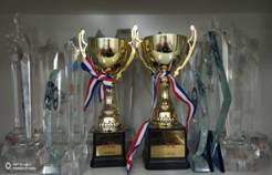 图1 领导与部分参赛学生、指导老师合影 图2学生参加学科竞赛获得的奖杯