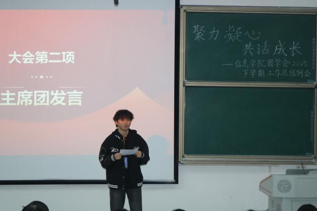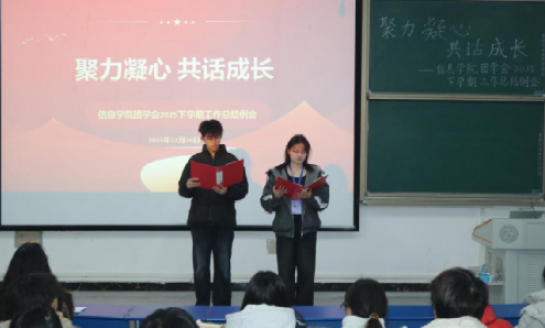 2025年12月26日中午,信息学院在致远楼102教室召开2025年下学期团学会工作总结例会。学院全体辅导员、团学会全体成员出席会议。会议以“聚力凝心,共话成长”为主题,对本学期工作进行了全面回顾与总结。