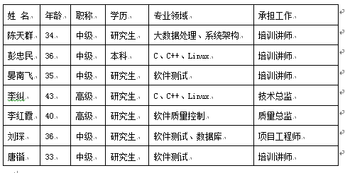 中心以高素质、专家型项目咨询队伍为核心,坚持统一整体化运作、动态团队式项目协作、透明开放型业务平台,建立了全方位的资源合作网络,与湖南省各高校及科研机构建立了长期、稳定的科技合作关系。公司全部人员均具有本科以上学历,专业涵盖计算机、软件开发、企业管理、人力资源、投资管理、信息情报等专业,形成了良好的学历结构和知识梯队结构。参与本次校企合作人才培养示范基地建设的教师信息如表2所示。
