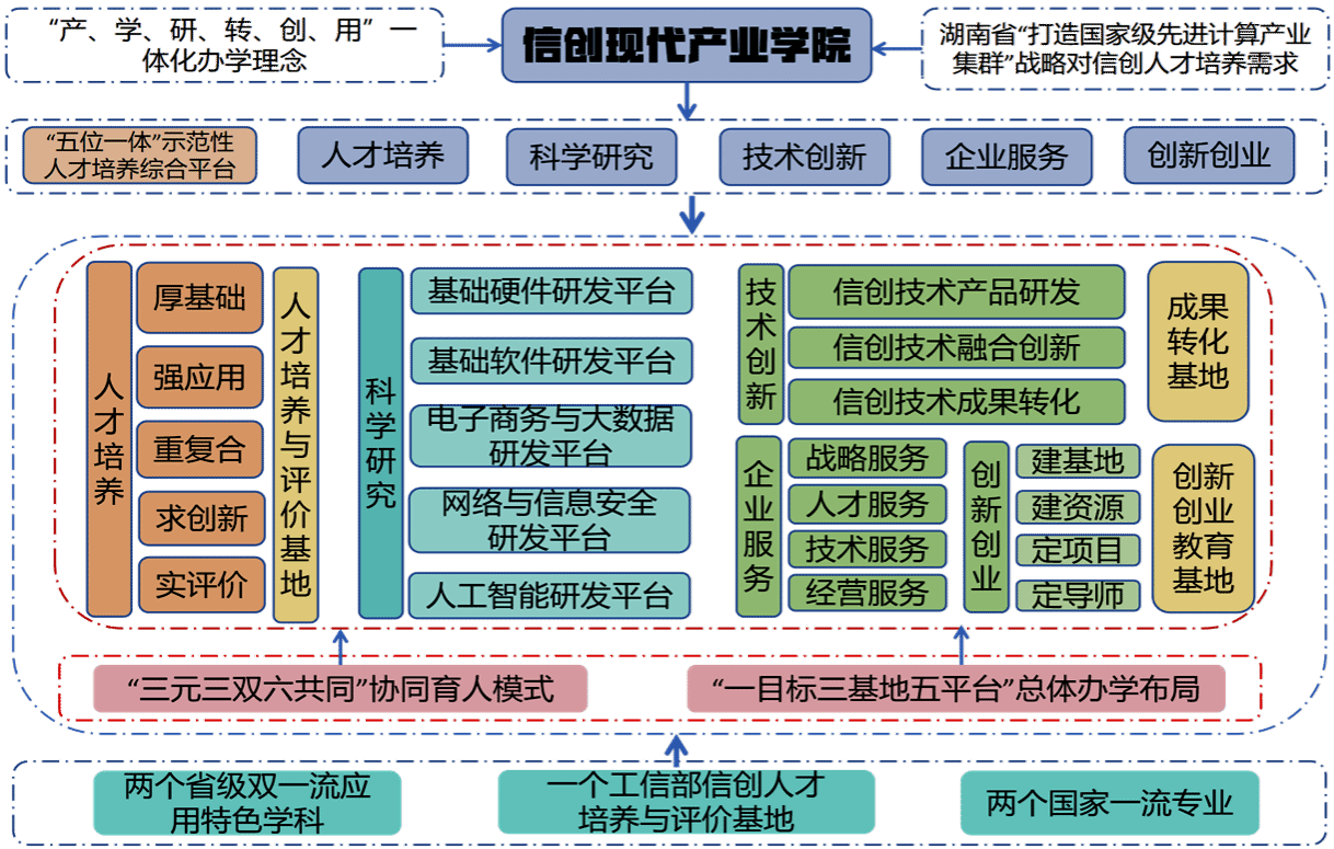 全面贯彻落实“产、学、研、转、创、用”一体化现代产业学院办学理念,对接湖南省“建成1-2个千亿级、5个左右500亿级规模电子信息产业基地,打造新一代信息技术引领的国家级电子信息产业集群”的要求,按照“一目标、三基地、五平台”总体办学定位,努力建设服务先进计算发展的应用型信息技术创新人才培养基地、信息技术科学研究中心、先进信息技术成果转化窗口、信息技术企业服务高地、信息技术创新创业摇篮。