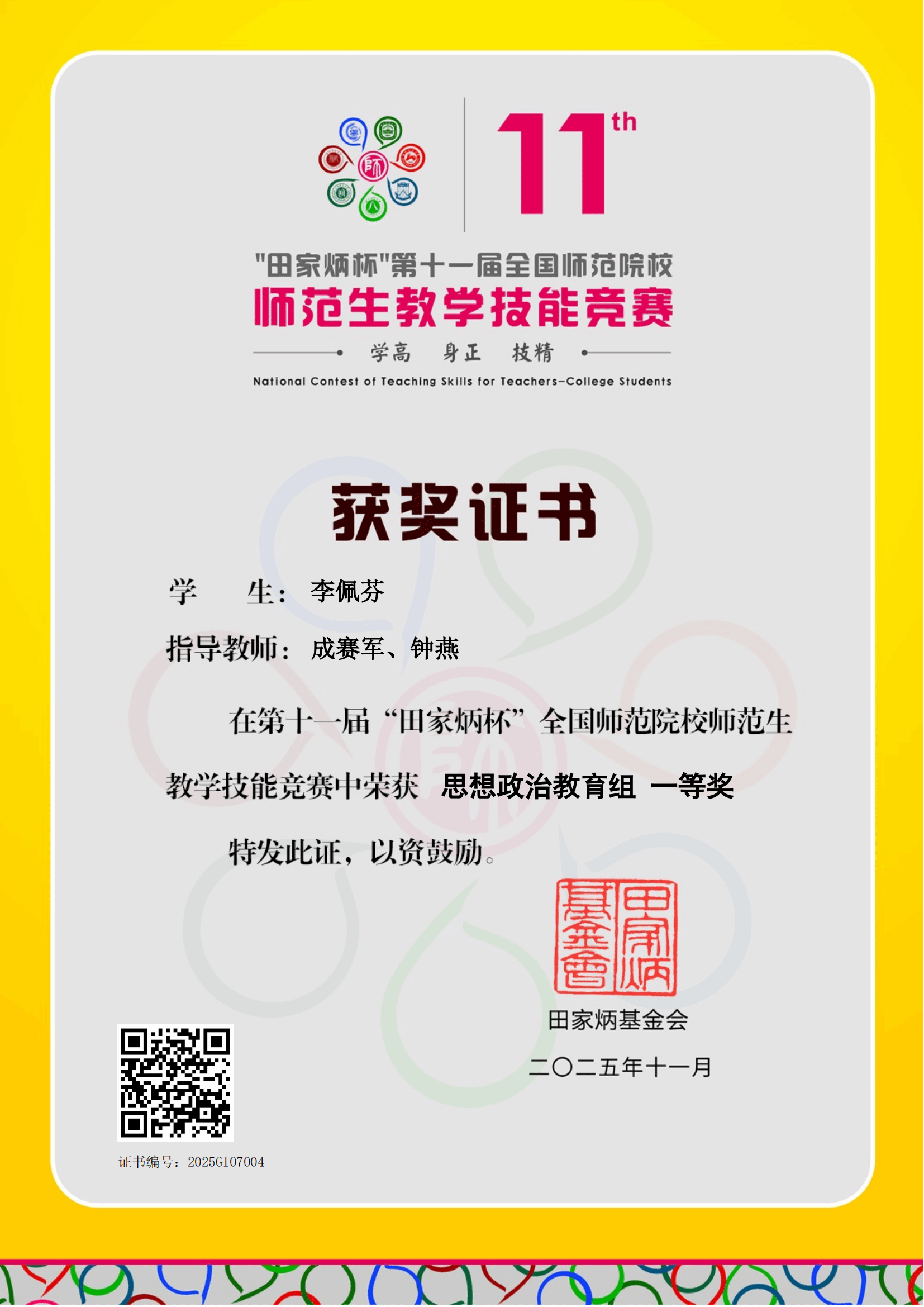 11月30日,第十一届“田家炳杯”全国师范院校师范生教学技能竞赛决赛圆满落幕。贝博马克思主义学院李佩芬同学凭借扎实的专业素养与出色的教学表现,在比赛中脱颖而出,荣获一等奖,彰显了学校在思政师范人才培养方面的显著成效。