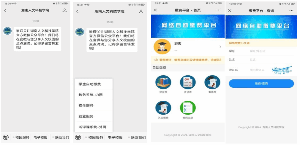 2.进入微信公众号,点击左下方的校园服务下的学生自助缴费菜单,进入缴费登录页面。点击游客,输入身份证号码、姓名、验证码,点击缴费/查询,登录主页面。