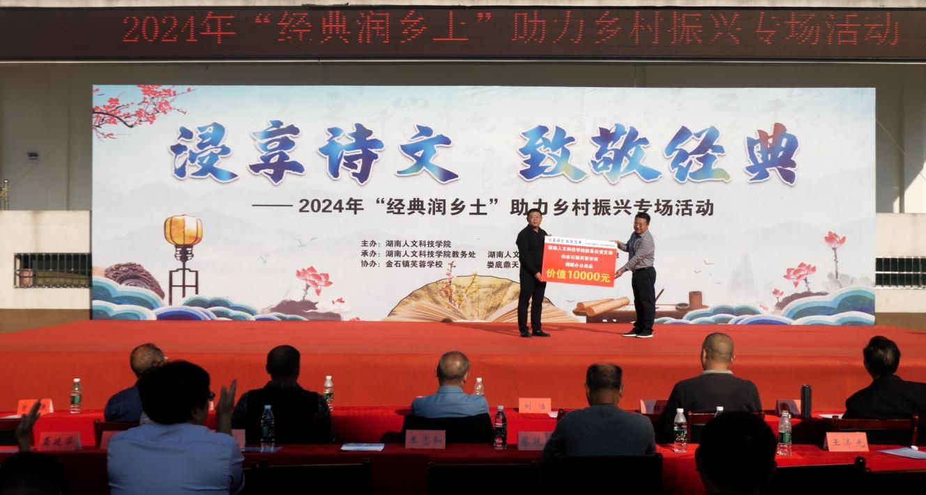 刘铁峰表示,场诵读活动搭建的是一个书香墨韵的舞台,它不仅是一次知识的传递,更是在乡村孩子的心中播下了经典文化的种子。这颗种子将在乡村振兴的沃土里生根发芽,为乡村文化的繁荣发展注入源源不断的动力,助力乡村向着更具文化底蕴的方向大步迈进。也希望大家能在此次活动中尽情品味语言文字的魅力,体会传统文化的精深,不断为弘扬传统文化、助力乡村振兴贡献力量并带领教务处党支部成员向金石镇芙蓉学校赠送了办公用品。