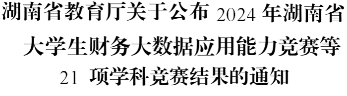 根据《关于组织举办 2024 年全省普通高校大学生学科竞赛的通知》(湘教通〔2024〕87 号)精神,我厅近期先后举办了 21 项大学生学科竞赛活动。经各竞赛组委会组织专家评审和公示,我 厅审定了各项竞赛结果,现予以公布。