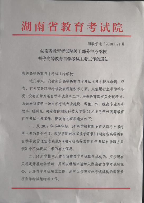 上一条:湘教考自字〔2018〕6号 关于印发《湖南省高等教育自学考试专业调整方案(2018年)》的通知 下一条:湘教考自字〔2017〕9号关于公布《湖南省高等教育自学考试省内统考课程考试大纲》的通知