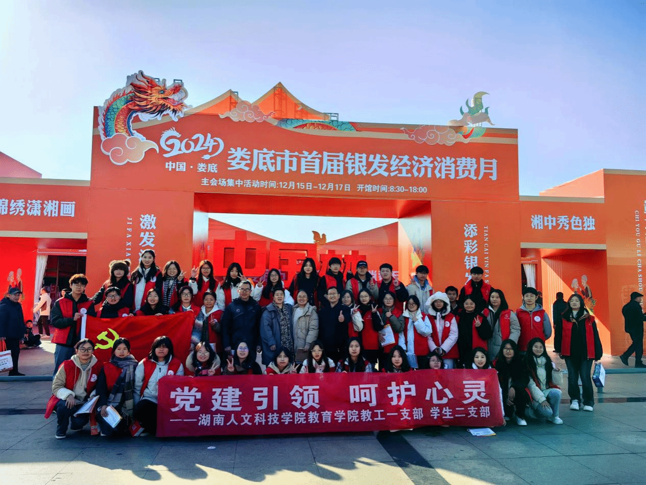 12月13-18日,教工一支部王旭红、陈尚恒、胡小兰、彭旭庆、文小辉、苏小七等教师党员与教育学院学生二支部部分学生党员,带领应用心理学专业68名志愿者,在孙水河公园、娄星广场等地,为娄底市首届“银发经济消费月”的启动仪式的准备及接下来的各种活动提供丰富多彩的志愿服务。服务娄底市民15000多人次。为提升娄底市老年人的心理健康水平,促进银发经济消费,构建和谐娄底、健康娄底、幸福娄底贡献专业力量。