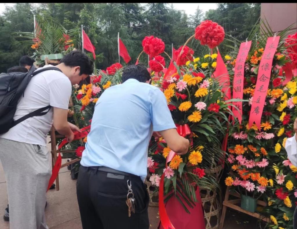 研学的第一站是毛主席铜像广场。毛主席铜像广场始建于1993年,扩建于2008年,总面积10万多平方米,分为休闲区、集会区、纪念区、瞻仰区四个区域。在瞻仰区,全体同学衣着整齐,庄严肃穆地站立在毛主席铜像前敬献花篮,表达对中国伟大领袖的缅怀与崇敬之情;在广场齐诵诗歌来缅怀一代伟人,感受深厚的革命情怀。