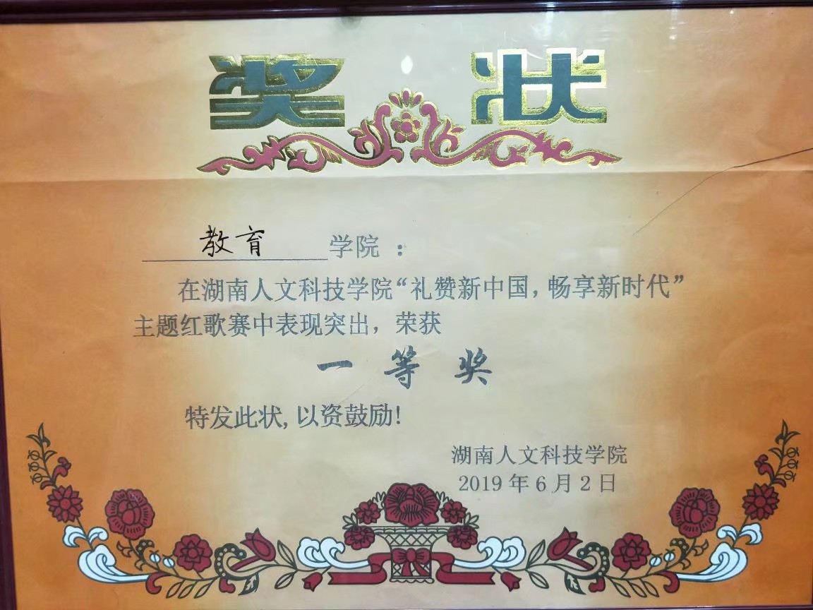 2019年6月2日晚,由校团委主办的“青春心向党,建功新时代”主题红歌赛在体育馆拉开帷幕。我院派出了以学前教育1701班、学前教育1702班、学前教育1703班共60人组成的参赛队。他们凭借一曲《祖国不会忘记》得到了全场的最高分,在十三个学院参赛队中脱颖而出获得了一等奖。