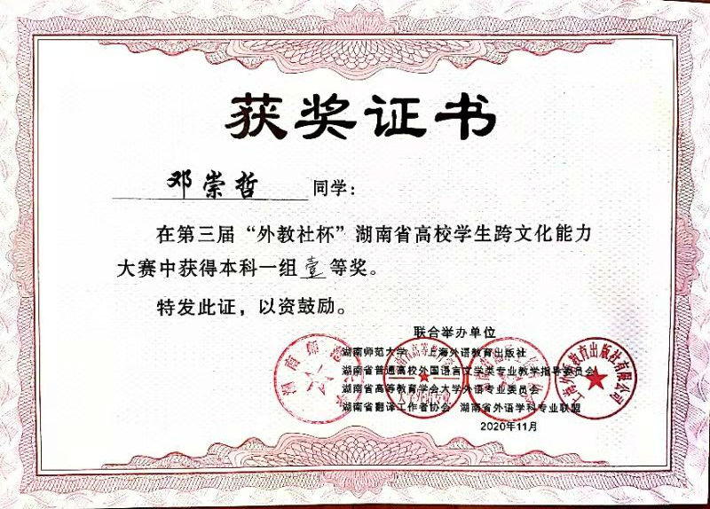 获奖选手邓崇哲是我院应用心理学专业18级学生。她一直热爱英语演讲,并为之不懈努力,经过学校层层选拔和专门培训,最终成为代表学校参赛的选手。她还代表学校参加了湖南省第二十六届普通高校大学生英语演讲比赛,并获得了团体二等奖、个人三等奖的好成绩。