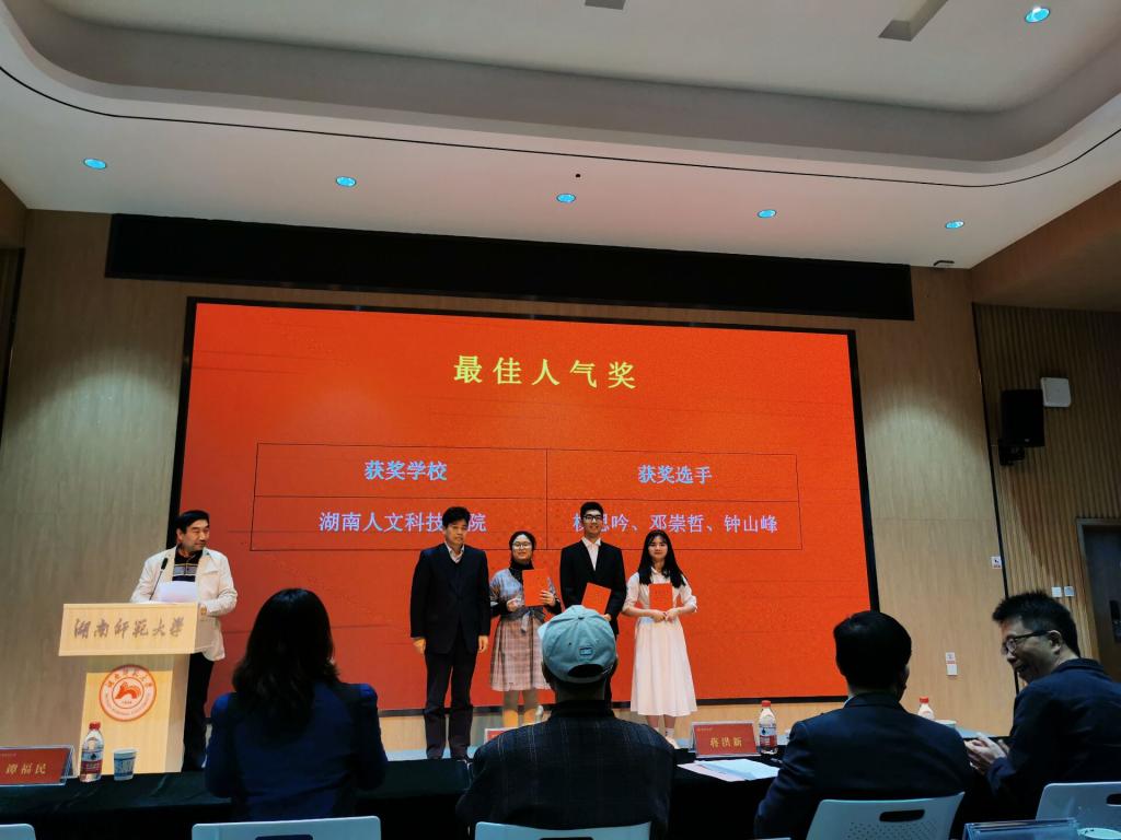 11月20日至22日,第三届“外教社杯”湖南省高校学生跨文化能力大赛在湖南师范大学举行。本次大赛共有来自全省的43所高校队伍参加,共有10支队伍晋级决赛。其中,代表贝博参赛的杨思吟(外国语学院)、邓崇哲(教育学院)、钟山峰(商学院)三名选手,经过激烈角逐,取得本科一组团队一等奖的好成绩。贝博代表队同时荣获“最佳人气奖”。