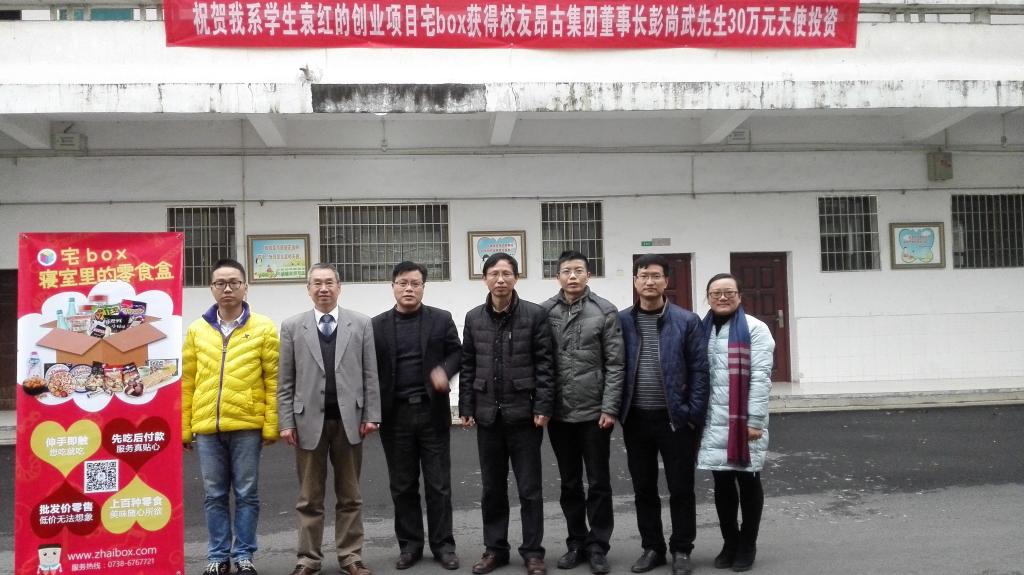宅box是一个定位于校园休闲生活的寝室零食自助式服务平台(隶属于娄底市巨鲨网络科技有限公司),主营业务是为高校大学生提供方便实惠的零食盒子服务,目前已进入启动运营阶段。公司CEO为我系应用心理学专业12级学生袁红,团队成员均为年轻的90后,有在校生、也有具有互联网公司工作经验的合作伙伴。经我院资深教师王旭红老师引荐,项目得到了我院杰出校友——深圳昂古集团董事长彭尚武先生的极大认可与大力支持,并倾情投资30万元助力项目更好更快的发展。