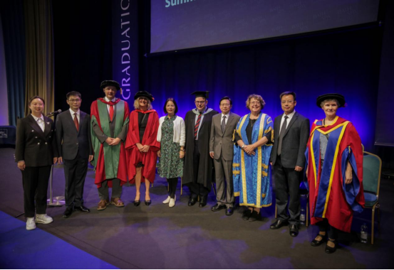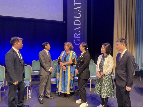 在巴斯巴大学的毕业典礼上,陈志国与巴斯斯巴大学校长Susan Rigby教授交流,并应邀在毕业典礼主席台就座,一行五人全程参加典礼仪式,厚重的仪式感和浓厚的学术氛围留下了深刻印象。