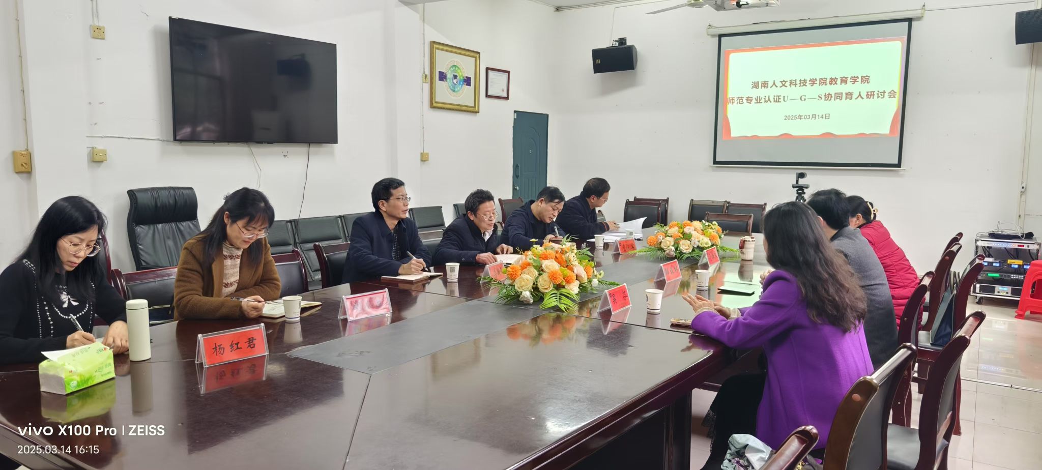 2025年3月14日下午,教育学院在甘澍楼304会议室举办师范专业认证U-G-S协同育人研讨会。应邀前来参加研讨会的人员有娄底市教育局师资培训中心党支部书记、主任邹兆林、副主任吴芬、娄底市中小学心理健康名师工作室首席名师许海文。教育学院院长蒋冰清、副院长曹俊军、副院长李国强及各教研室主任、教师代表等参加。蒋冰清主持研讨会。