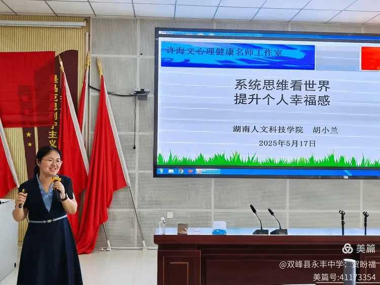 5月17日,娄底市许海文中小学心理健康名师工作室举行2025年“说评议”联动式课堂教学观摩研讨活动。胡小兰博士应邀参加做专题讲座《系统思维看世界,提升个人幸福感》,以独特的视角和深刻的见解,带领大家从系统思维的角度重新审视世界和自身。胡老师的讲座内容新颖、逻辑严密,让成员们对幸福有了更全面、更深刻的理解,也为他们在今后的生活和工作中提升幸福感提供了新的视角和方法。
