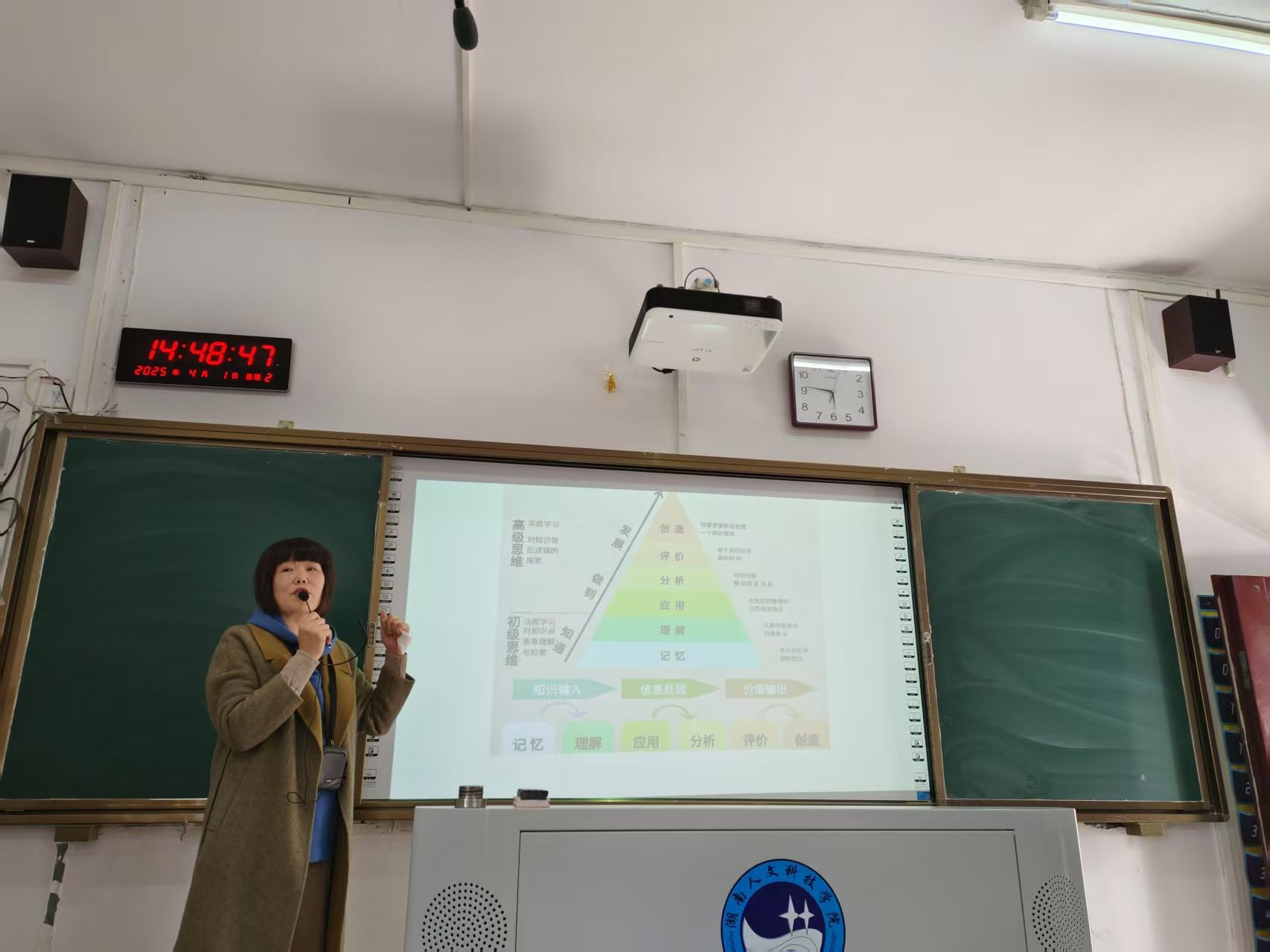 为顺应新质生产力发展、人工智能时代背景下地方应用特色学院培养高素质应用型人才的迫切要求,加大教育教学改革力度,推动各专业深化贯彻OBE理念、提高课堂教学的“两性一度”(高阶性、创新性和挑战度),推动课堂教学的研讨式教学、项目式教学、案例式教学等新形态教学方法的应用,4月1日下午,教育学院在甘澍楼306多媒体教室,举办了一次主题为“AI赋能:挖掘“高阶问题”提升课堂‘两性一度’”专题教研活动。本次活动邀请教育学院资深教师——湖南省优秀教师、院教学督导陈杰副教授主讲。教育学院全体院领导和教职工参加,院长蒋冰清主持了专题教研活动。