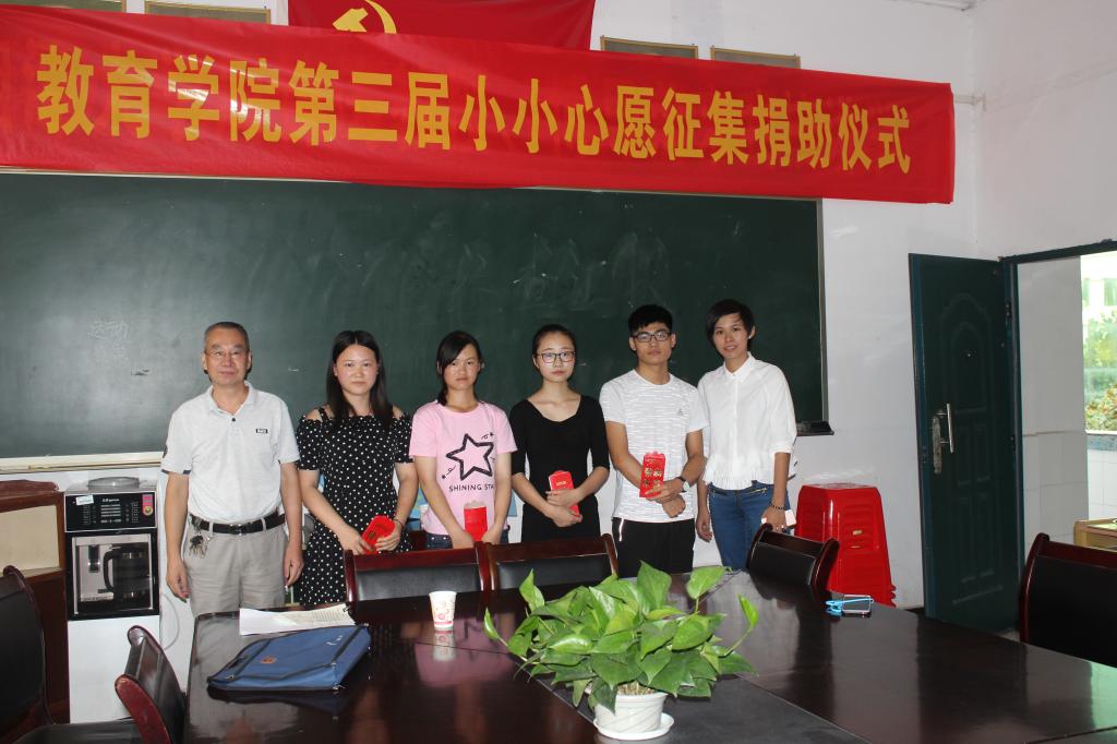 9月18日下午,教育学院第三届“小小心愿”捐赠仪式在甘澍楼3楼会议室举行,参加本次仪式的成员有申忠明书记,李佳维老师和五位获助学生。