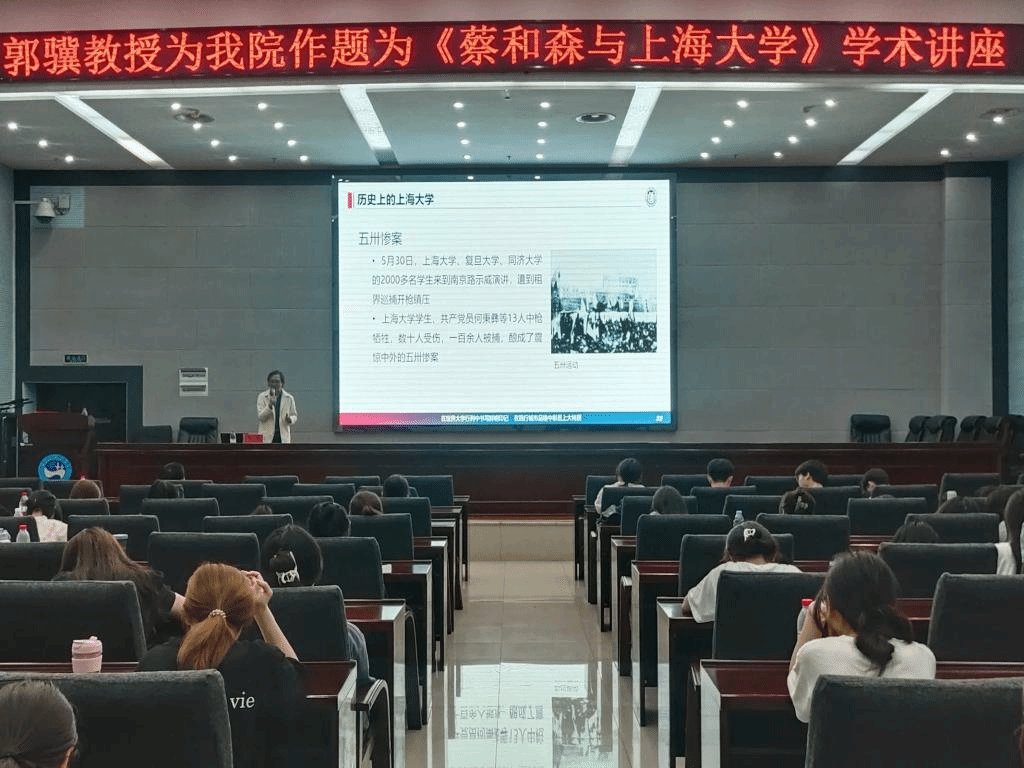 讲座中,郭骥教授主要从历史上的上海大学、蔡和森在上海大学期间的活动、上海大学的湖南籍师生三个方面展开论述。他详细地介绍了上海大学创立的时间、背景、历史地位、作用及其学科设置,深入浅出地分析了上海大学改组和四次迁址的过程。郭骥教授以蔡和森在上海大学期间的活动为切入点,阐述了中国共产党早期党员、无产阶级革命家蔡和森为革命不怕牺牲的英勇事迹,生动地展现了蔡和森对党忠诚、勇于担当的精神。郭骥教授表示,我们讲述老上大的这段珍贵的历史,是为了赓续、继承时间车轮滚滚向前中的坚韧不拔精神,让红色基因代代相传。随后,郭骥教授提到部分上海大学的湖南籍师生,鼓励大家道风发正是少年,同学们要努力学习,奋力追逐自己的梦想,不负青春意气。