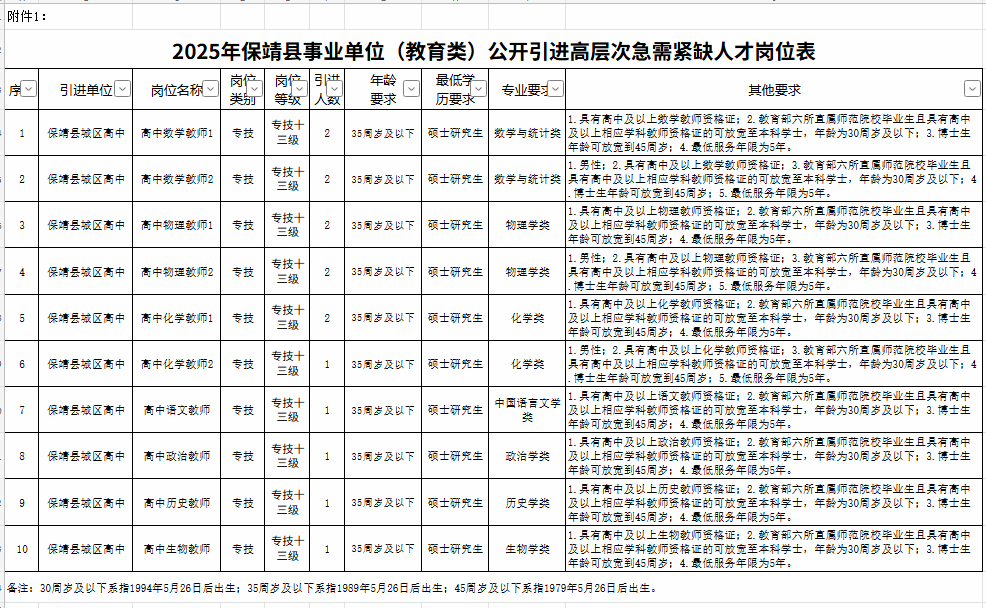 详见《2025年保靖县事业单位(教育类)公开引进高层次急需紧缺人才岗位表》(附件1)。