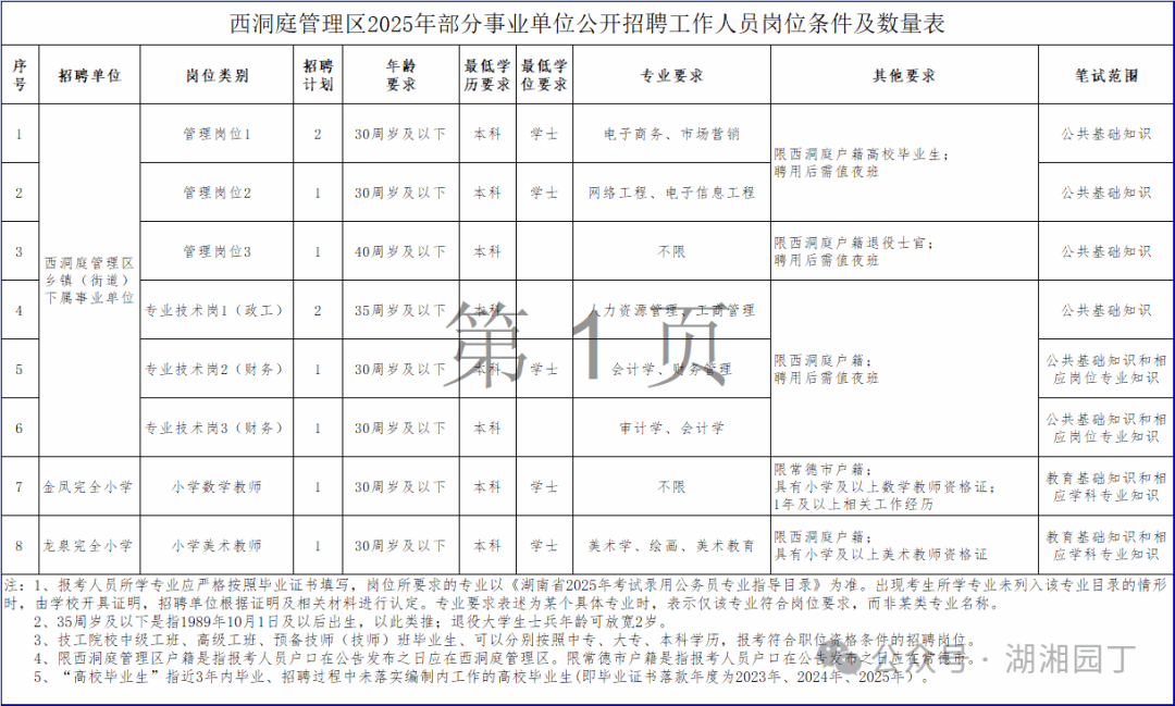 招聘计划10名。具体招聘计划及要求详见《西洞庭管理区2025年部分事业单位公开招聘工作人员岗位条件及数量表》(附件1,以下简称“岗位表”)。专业名称主要参考《湖南省2025年考试录用公务员专业指导目录》(附件2),报考人员的专业应严格按照毕业证书填写。