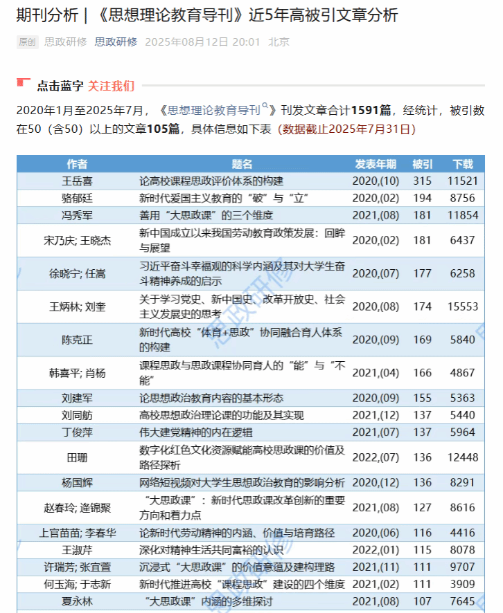 近日,全国高校马克思主义理论与思想政治教育指导性期刊、CSSCI中文社会科学引文索引来源期刊《思想理论教育导刊》公布近五年高被引论文,贝博马克思主义学院教授杨国辉发表于该刊2020年第12期的研究论文《网络短视频对大学生思想政治教育的影响分析》成功入选。高被引论文被认为是"某一学科中质量高、影响力大的精品论文",可以看作是一个研究领域学术发展的风向标。