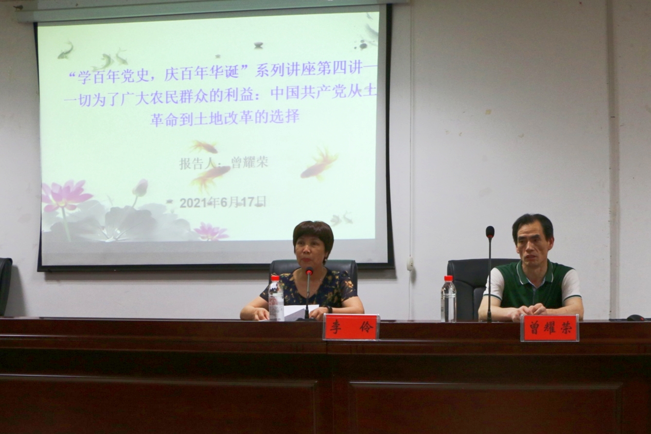 为庆祝中国共产党建党一百周年,进一步宣传阐释好党的创新理论和中国特色社会主义理论,引导广大青年学生学党史、悟思想、强信念、跟党走,深入推动党史学习教育走深走实。湖南省中国特色社会主义理论体系研究中心ballbet贝博bb艾弗森基地、湖南省党的创新理论研究基地ballbet贝博bb艾弗森基地在近期联合举办“学百年党史,庆百年华诞”系列讲座。6月17日晚,系列讲座第四讲在图书馆415学术交流中心开讲,第四讲由我院曾耀荣教授主讲《一切为了广大农民的利益:中国共产党从土地革命到土地改革的选择》,我院党总支书记李伶主持,中特理论基地秘书周浩博士、基地主要研究成员及贝博100多名学生参与讲座。