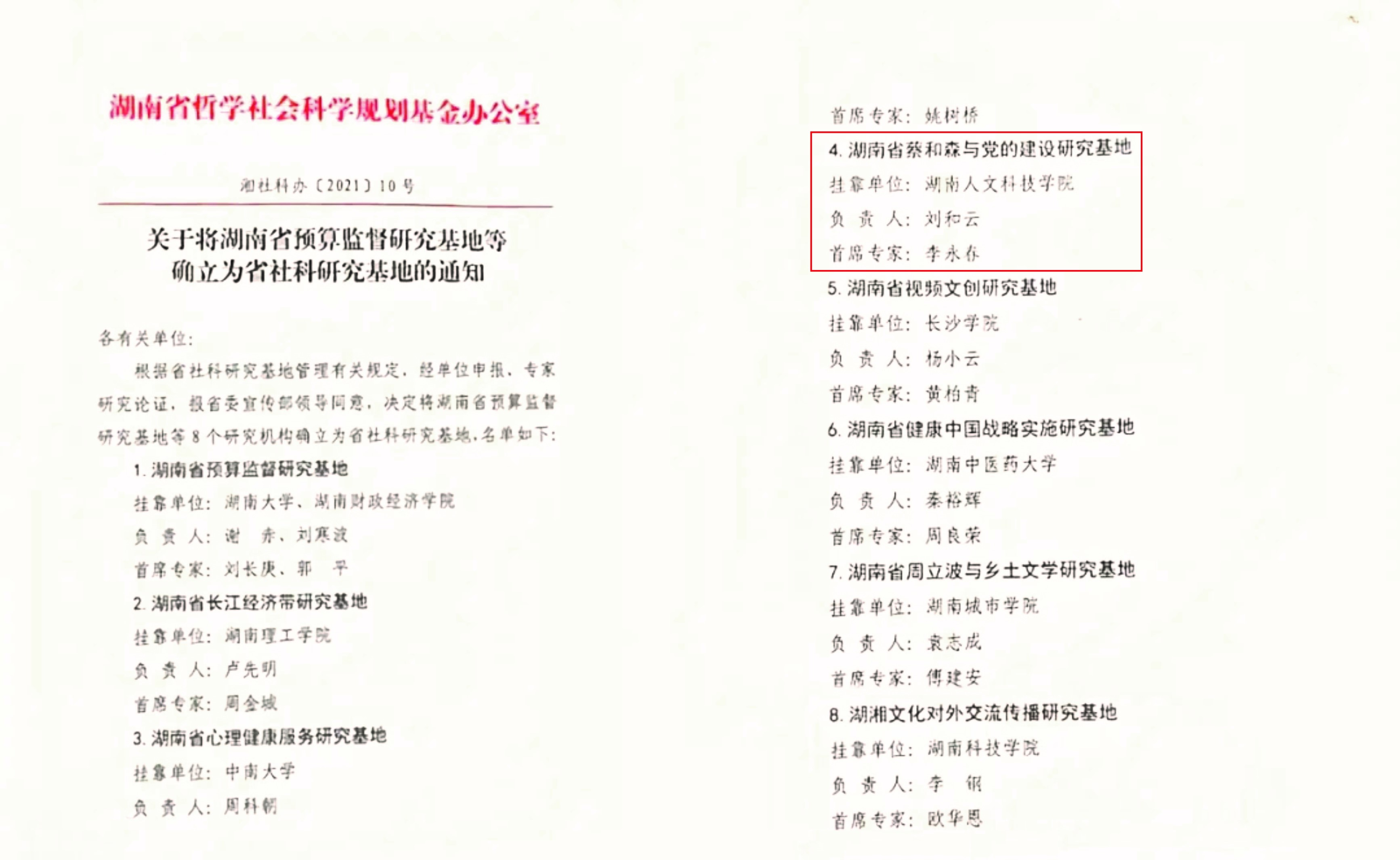 近日,湖南省哲学社会科学规划基金办公室发布《关于将湖南省预算监督研究基地等确立为省社科研究基地的通知》,根据省社科研究基地管理有关规定,经单位申报、专家研究论证,报省委宣传部领导同意,贝博“蔡和森与党的建设研究基地”成功获批为湖南省社科研究基地。