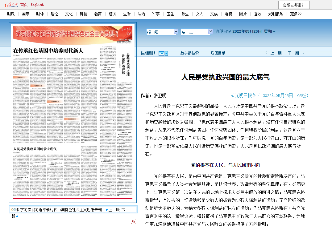 2022年5月25日,《光明日报》(理论版)刊发了我院院长、马克思主义理论省应用特色学科带头人、思想政治教育省一流专业负责人、中国特色社会主义理论体系研究中心ballbet贝博bb艾弗森基地首席专家张卫明教授《人民是党执政兴国的最大底气》一文,这是张教授第六次在《光明日报》发表理论文章。