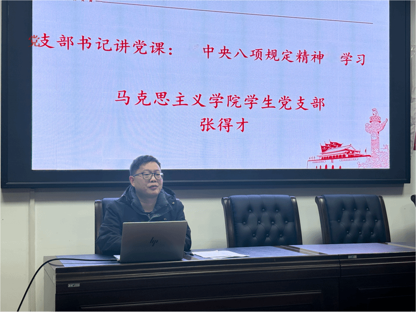 12月9日,马克思主义学院学生党支部在若谷楼116会议室开展中央八项规定精神专题党课学习。本次学习由学生党支部书记张得才主讲,学院全体学生党员参加。