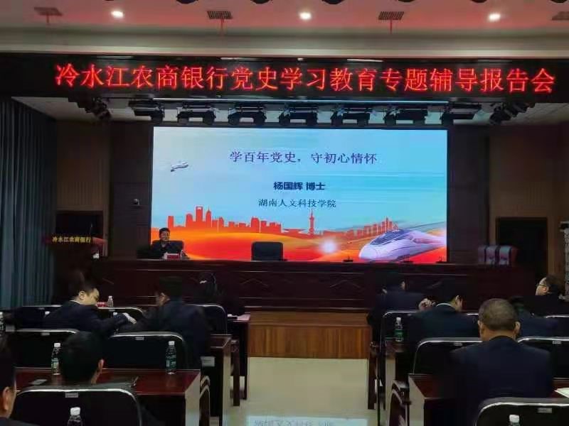 为庆祝中国共产党建党一百周年,矢志践行党的初心使命,4月19日晚,副院长杨国辉应邀为冷水江农商银行全体党员作“学百年党史,守初心情怀”的党史学习教育专题报告会,讲座由冷水江农商银行行长苏平华主持,该行行全体在家班子成员及全行100余名党员干部参加。