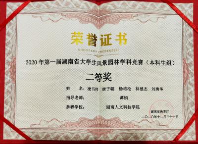 2020年12月获湖南省第一届大学生风景园林学科竞赛(本科生组)二等奖;