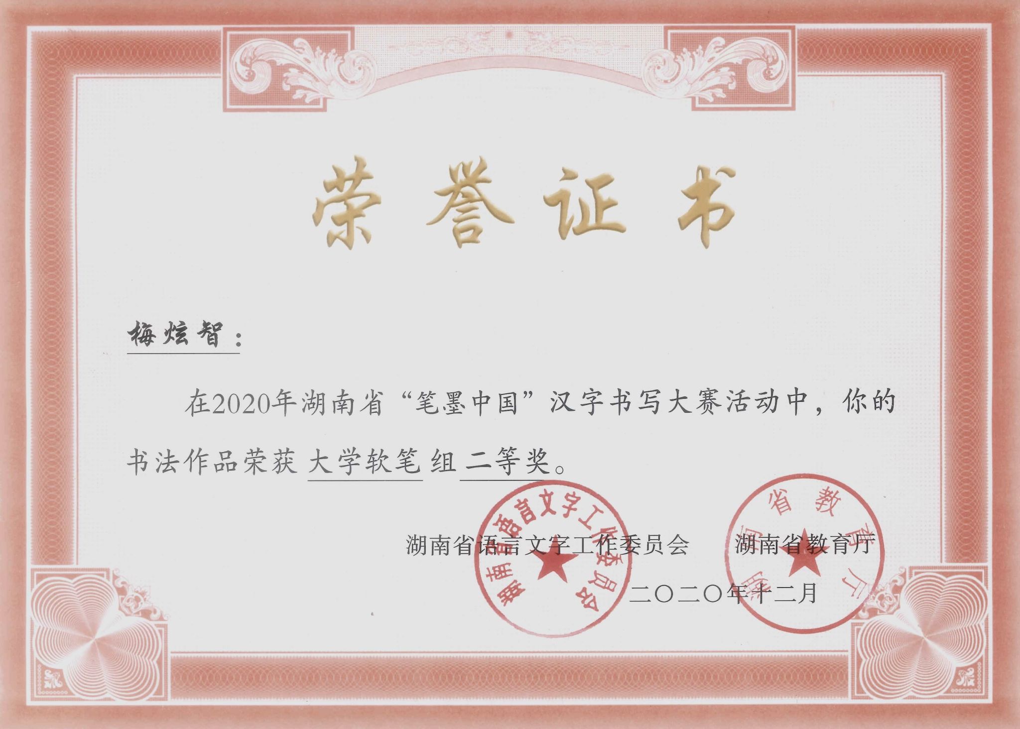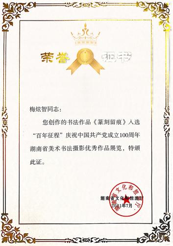 梅炫智,同学在校期间,担任班级考勤班长职务,在担任职务期间积极协助辅导员管理日常事务,凭着认真负责、领导意识强、处理日常琐事得当,得到了导员的认可,后联络各班班长、团支书以及其他班委组织专业活动和信息收集,成为导员的得力助手,同时也取得了专业同学们的一直认可,在大一学年便获得了三好学生标兵这一荣誉称号。更是在大二学年连续获得三好学生荣誉称号,成为同学们学习的榜样。大三时,他主动承担起学院书法俱乐部的管理工作,致力于推广书法艺术,其领导力和影响力在校园内广泛传播,激发了更多同学对书法的兴趣。