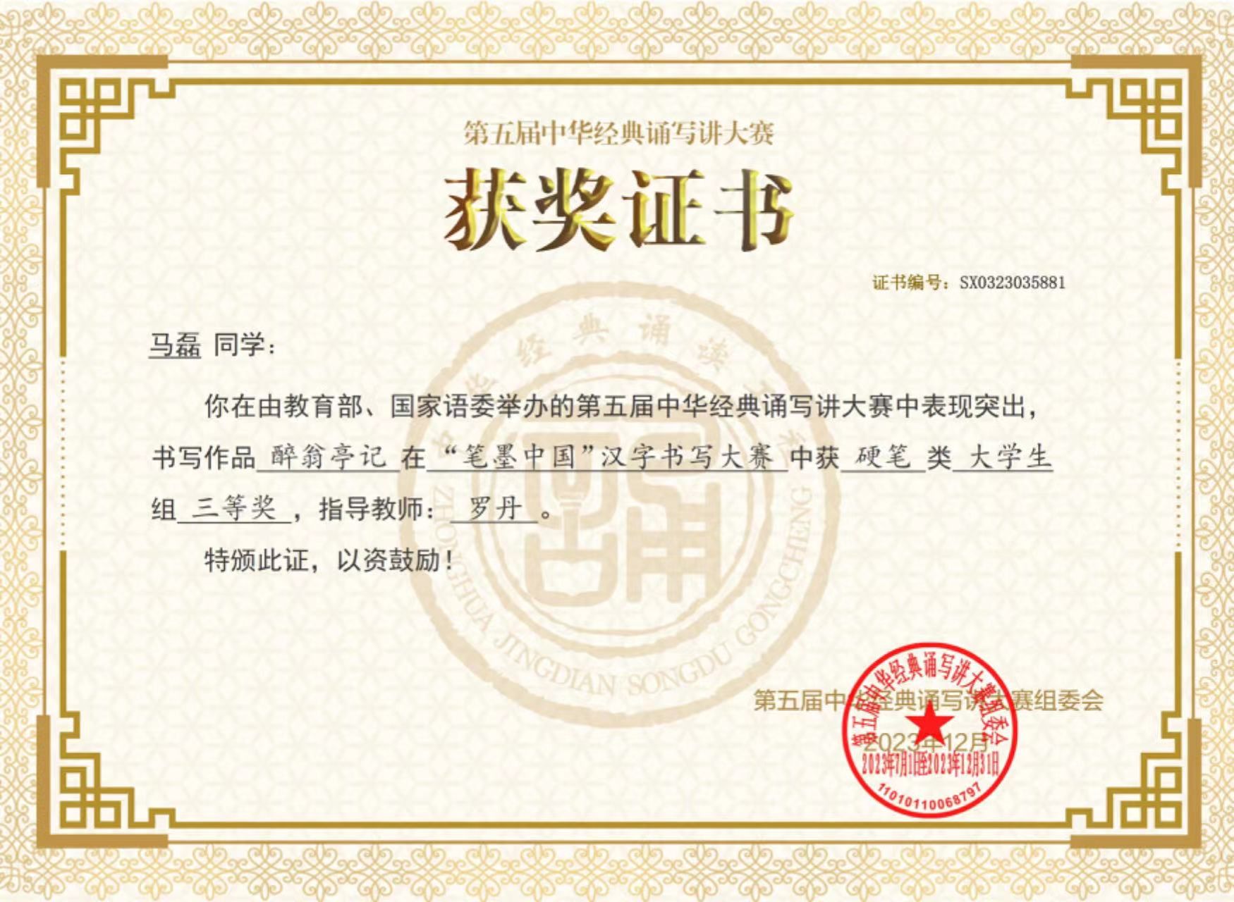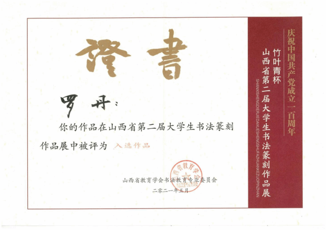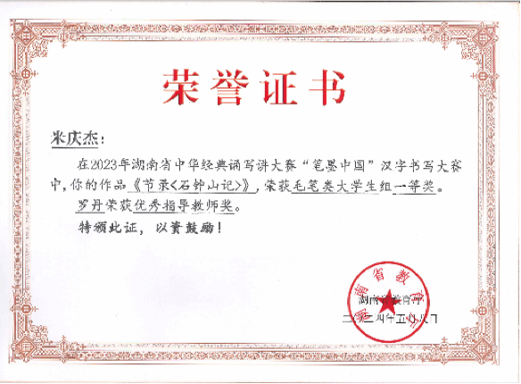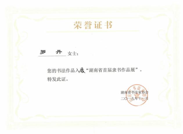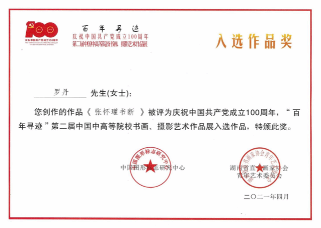 书法作品入展“湖南省首届隶书展”、“第五届湖南省中小学教师书法展”、“第二届中国高等院校书画摄影艺术展”、“山西省第二届大学生书法篆刻展”等省市级赛事数十次。指导学生作品多次在教育部、湖南省教育厅举办的书法比赛中获奖,并获“优秀指导老师奖”。