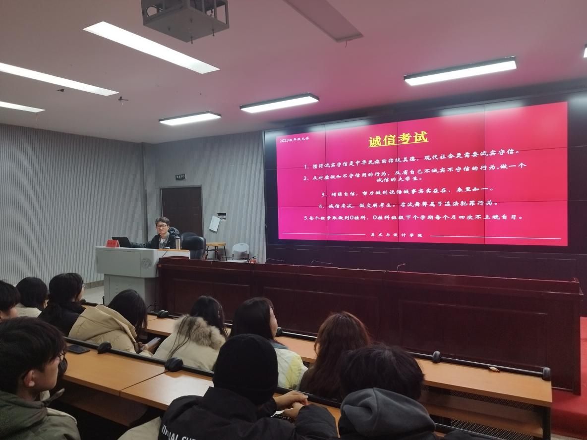 为进一步推进学院学风建设,加强考风考纪,引导同学们力学笃行,诚信迎考, 12月24日晚,学院在逸美楼报告厅举行2023-2024学年第一学期诚信考试动员大会。学院学工办柳泽伟老师、教务办欧阳双老师及学院2023级学生参加本次会议。