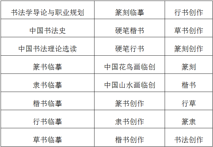专业核心课程:中国美术史、外国美术史、艺术概论、素描、色彩、水彩、透视学、解剖学、中国画、油画、水彩画、版画、雕塑、陶艺、美术教材教法、教育学、心理学等。