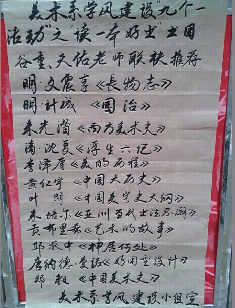 “读一本好书”活动是美术系学风建设“九个一活动”的重要组成部分。为此,学风建设领导小组副组长陈天佑与谷重等青年教师为同学们精心开列了“好书书目”,以期开拓同学们的学术视野,丰富同学们的学术素养。