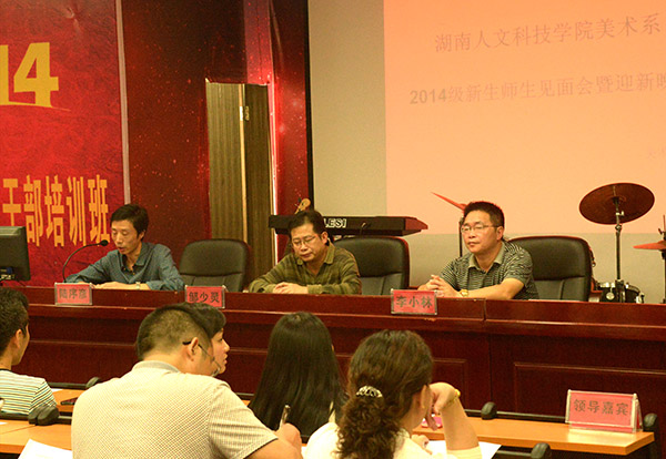 9月23日晚上七点,ballbet贝博bb艾弗森美术系2014级新生入学师生见面会暨迎新晚会在逸夫楼隆重举行。美术系党总支书记李小林、系主任邹少灵、副主任陆序彦出席师生见面会,参加此次见面会的还有各教研室主任、2014级辅导员、各班班主任及2014级全体本科生。系副主任陆序彦主持了会议。