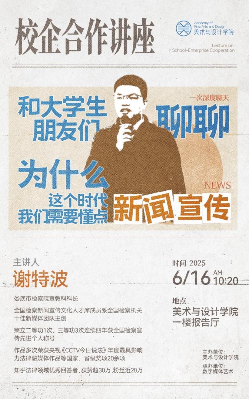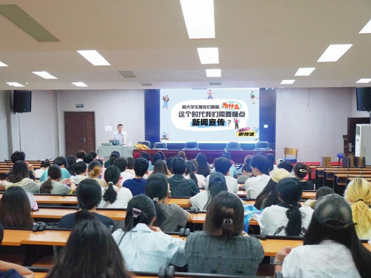 为提升学生媒介素养与信息甄别能力,培养适应新时代的传播意识和专业视野,6 月 16 日上午,ballbet贝博bb艾弗森美术与设计学院在逸夫楼报告厅举办了一场别开生面的专题讲座 ——《和大学生们聊聊:为什么这个时代我们需要懂点新闻宣传》。此次讲座特邀娄底市人民检察院宣教科科长、全国检察新闻宣传文化人才库专家谢特波担任主讲嘉宾。数字媒体艺术专业教研室全体教师以及大一至大三的学生共同参与了此次活动,学院副院长贺平也出席了本次讲座。